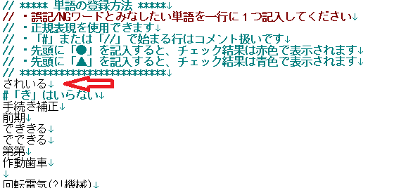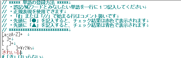 - 誤記/NGワードとして検出したい単語を、一行に1つ記入