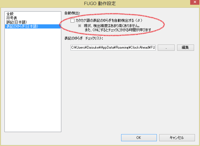 なお、FUGOの「設定」→「表記のゆらぎ(日本語)」において、「」のチェックをONにすることで、カタカナ用語のゆらぎについてはある程度、自動検出できます。